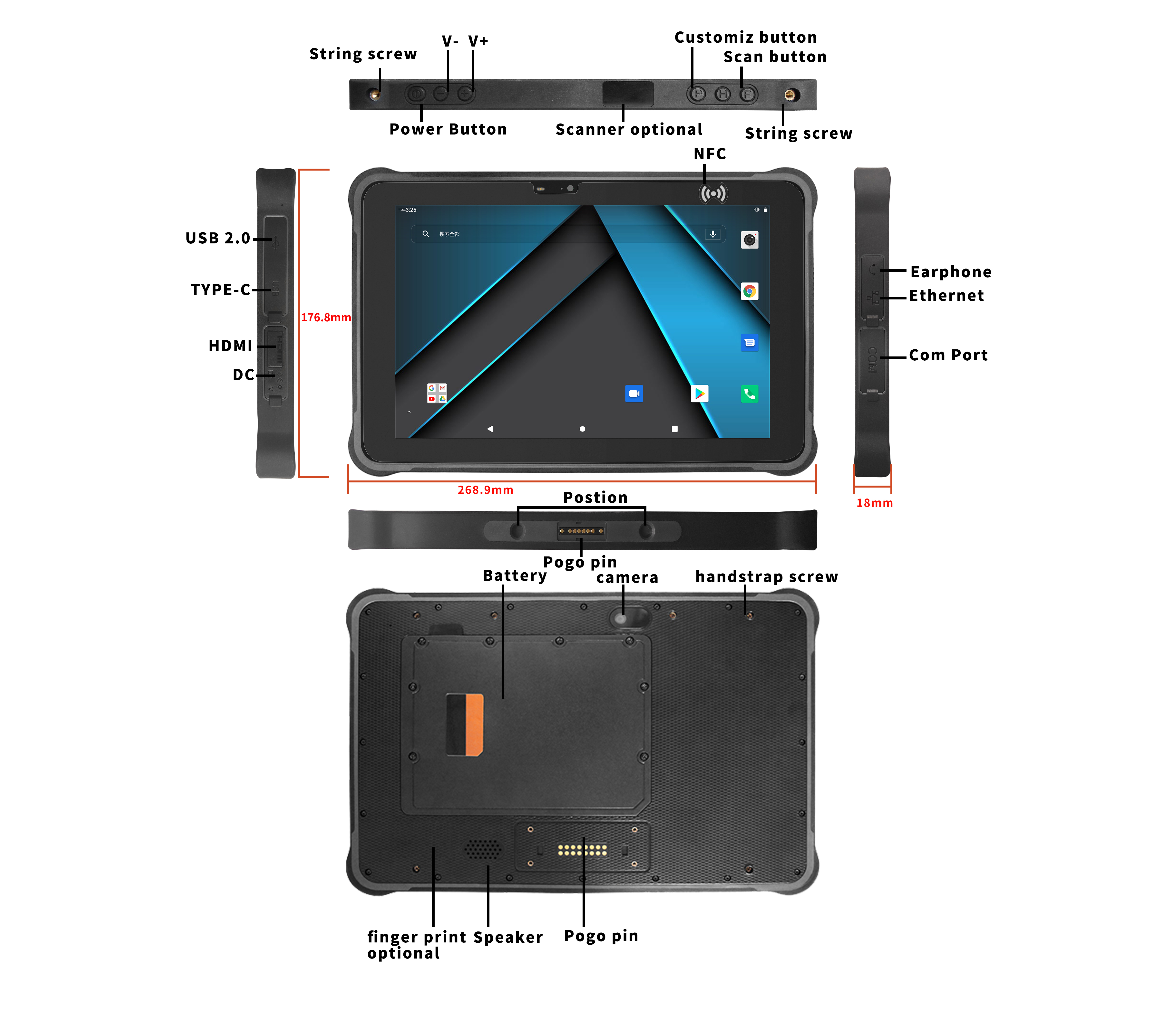 Type-C ×1 (OTG), SIM-Kartenslot×1, TF-Kartenslot×1, Kopfhöreranschluss×1, DC-Anschluss×1 (3,5×12 mm), USB 2.0 ×1, RJ45×1, RS232×1, HDMI×1 (nur 8+256-Version) Pogopin unten: USB 2.0; Ladeanschluss; RS232 Pogopin hinten: USB 2.0; RS232 |