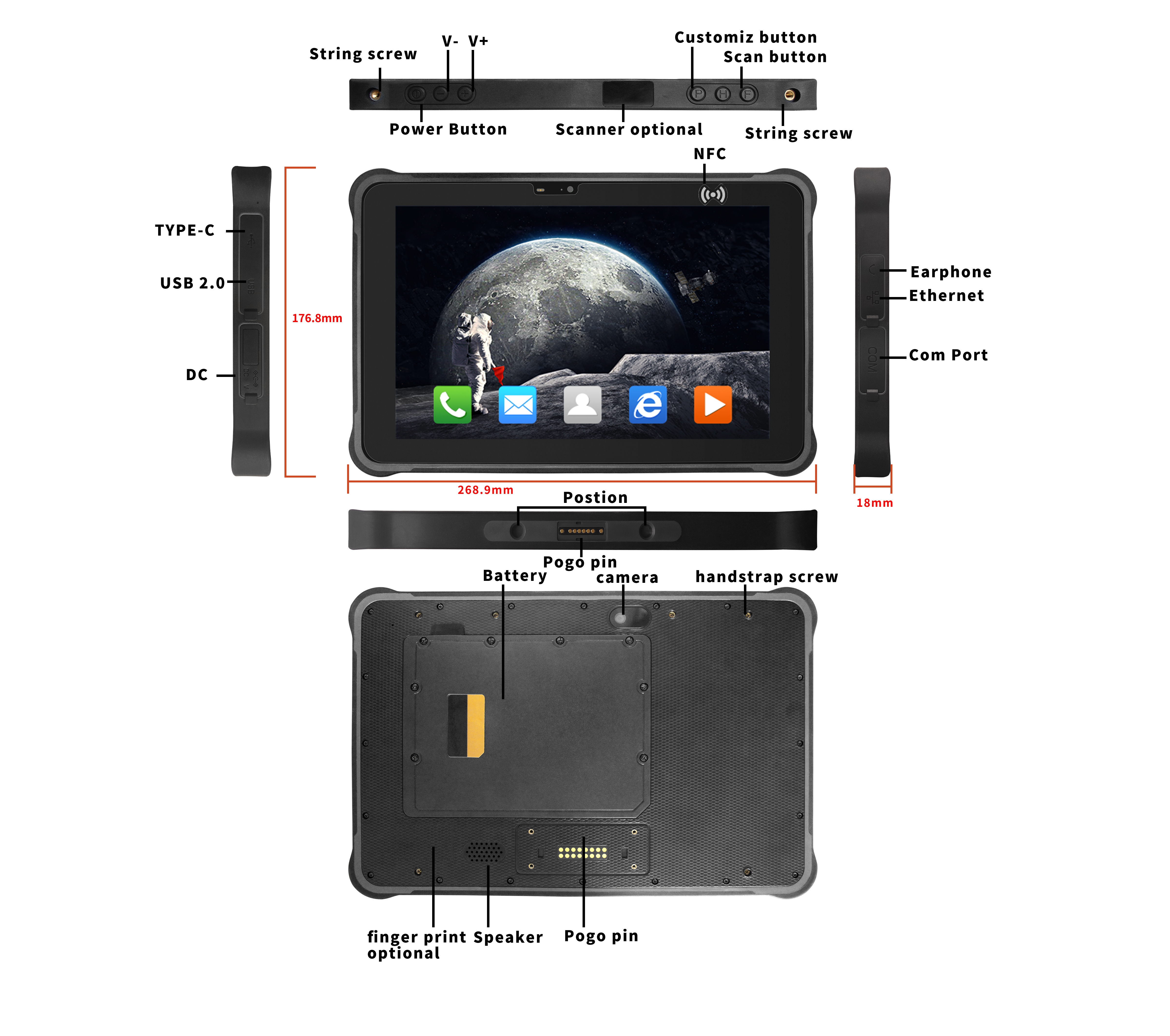 Type-C ×1 (OTG); SIM-Kartenslot×1; TF-Kartenslot×1; Kopfhöreranschluss×1; DC-Anschluss×1 (3,5×12 mm); USB 2.0 ×1; RJ45×1; RS232×1 Pogopin unten: USB 2.0; Ladeanschluss; RS232 Pogopin hinten: USB 2.0; RS232 |