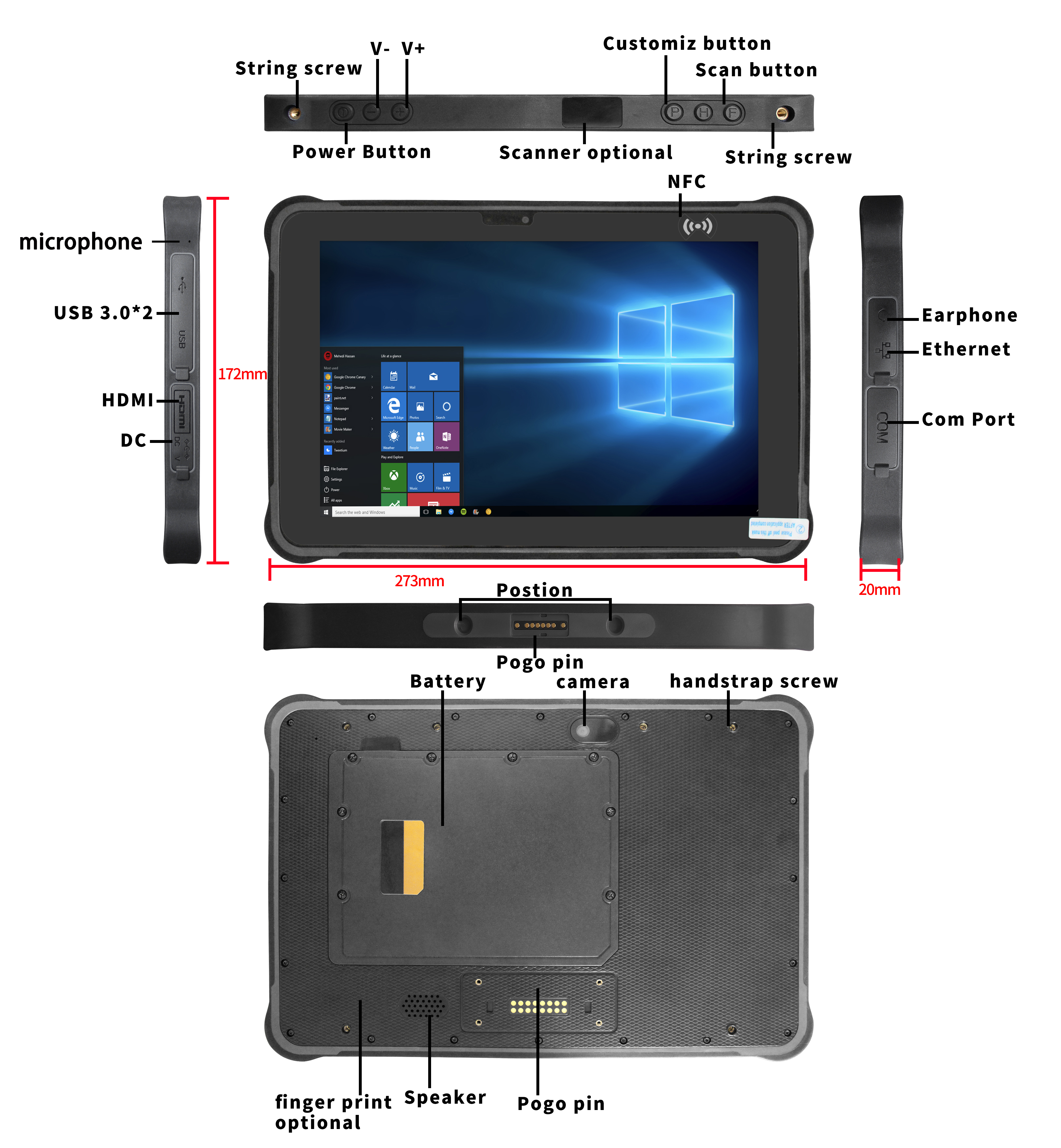 HDMI×1; SIM-Kartenslot×1; TF-Kartenslot×1 (maßgeschneiderte Artikel); Kopfhöreranschluss×1; DC-Anschluss×1 (4,0×15 mm); USB 3.0 ×2; RJ45×1; RS232×1 Pogopin unten: USB 2.0; Ladeanschluss; RS232 Pogopin hinten: USB 2.0; RS232 |
