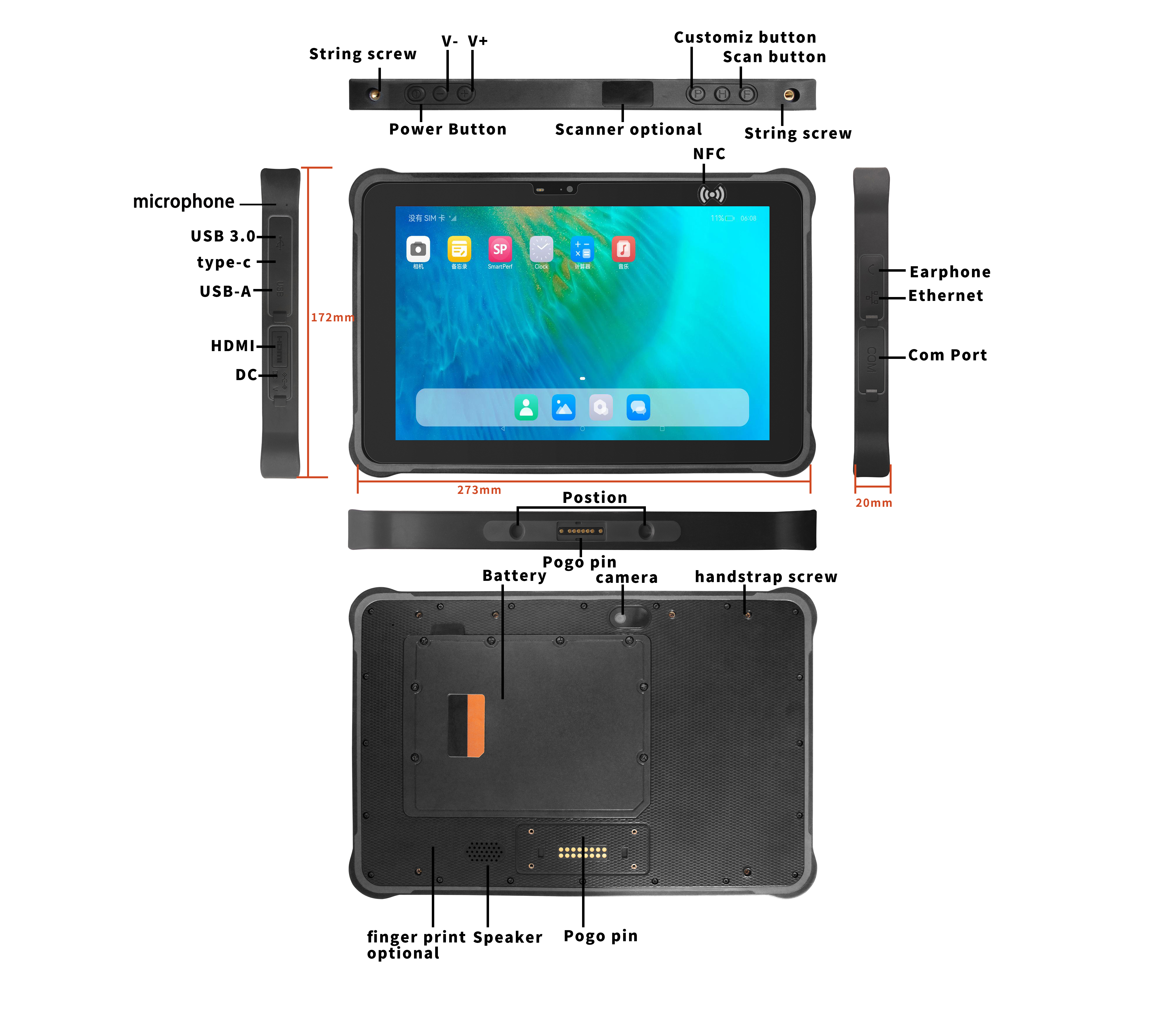 USB Typ-C ×1 (Unterstützung von OTG; Schnellladung); SIM-Kartenslot ×1; TF-Kartenslot ×1; Kopfhöreranschluss ×1; DC-Anschluss ×1 (4,0×15 mm); USB-A: USB 2.0 ×1 + USB 3.0 ×1; RJ45 ×1; RS232 ×1; HDMI ×1 Unterer Pogopin-Anschluss: USB 2.0; Aufladen; RS232 Rückseitiger Pogopin-Anschluss: USB 2.0; RS232 |