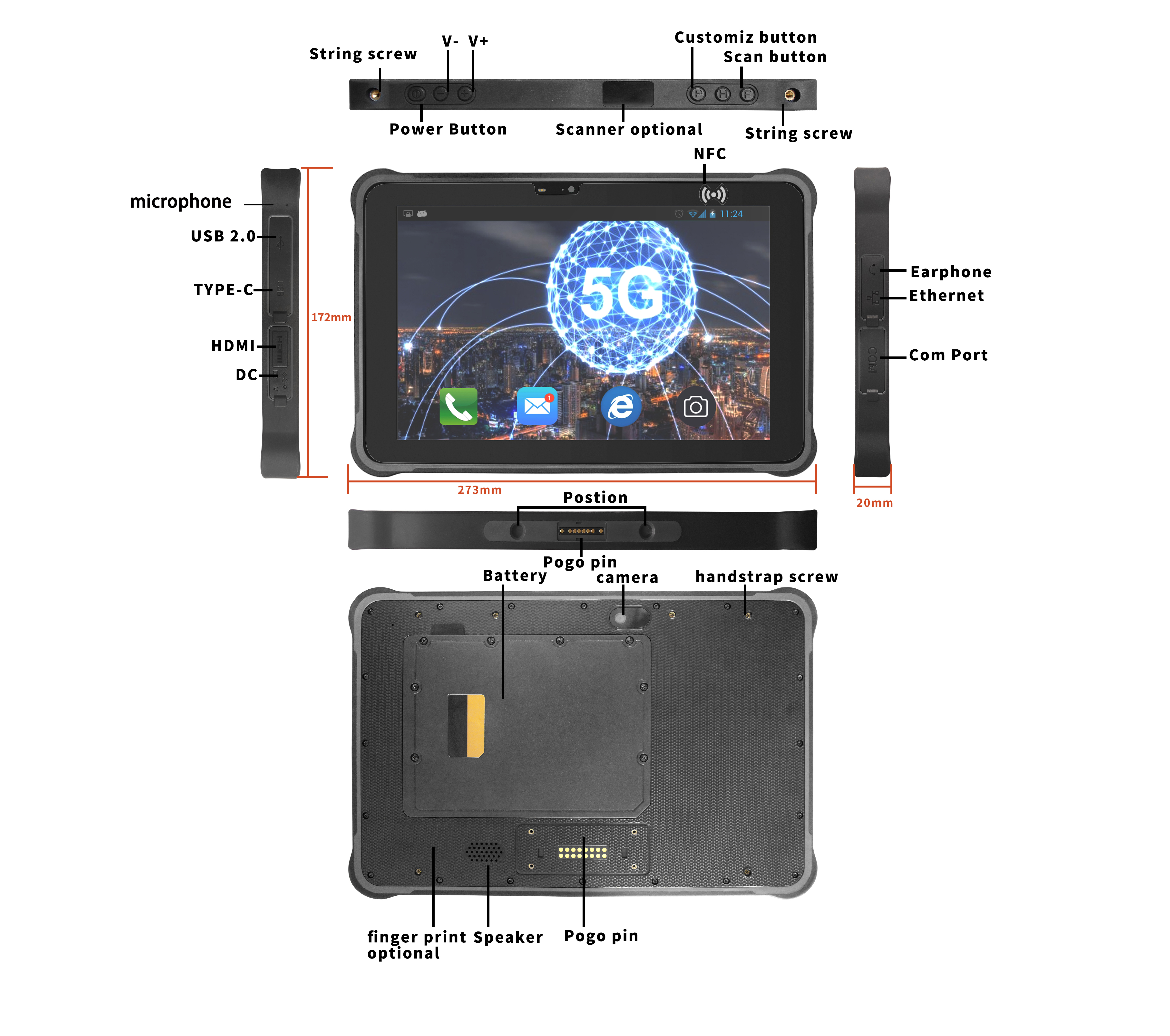 Type-C *1 (OTG); SIM-Kartenslot*1; TF-Kartenslot*1; Kopfhörer*1; DC*1 (3,5×12mm); USB 2.0 *1; RJ45*1; RS232*1 Unterer Pogopin: USB 2.0; Aufladen; RS232 Rückseitiger Pogopin: USB 2.0; RS232 |