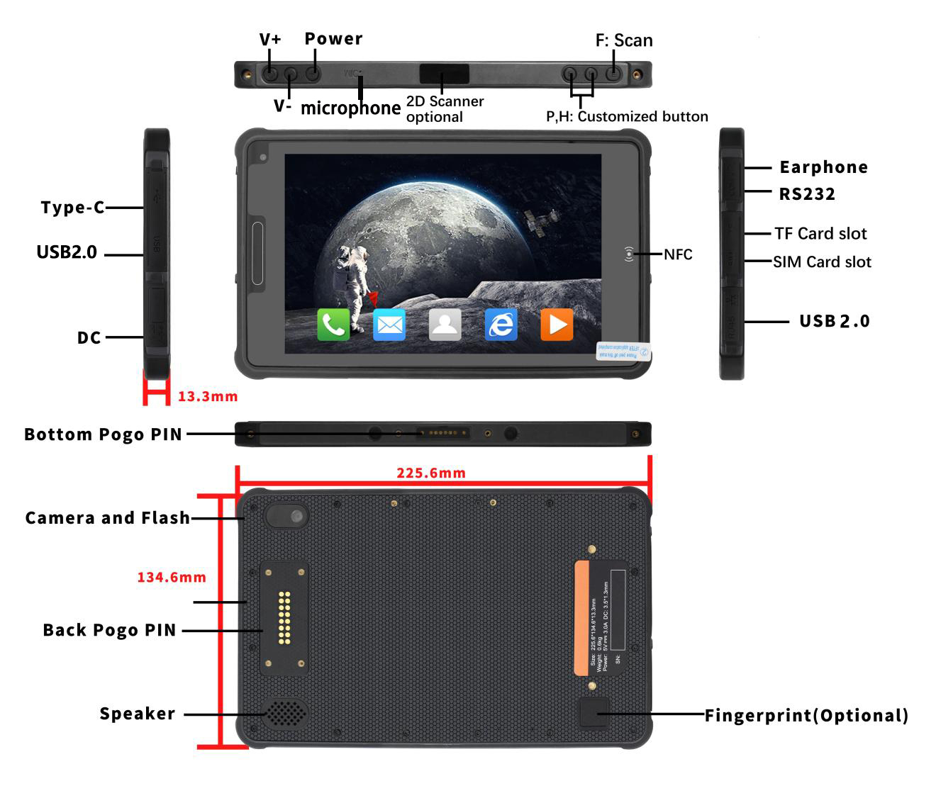 Dieses robuste Android 11-Tablet in Industriequalität verfügt über einen MT8788-Octa-Core-Prozessor, einen 8-Zoll-HD-Bildschirm, einen 7800mAh-Akku für eine lange Akkulaufzeit und unterstützt 4G-, BeiDou-Positionierung, NFC und 2D-Scanning. Es bietet IP65-Schutz, 1,2 Meter Fallfestigkeit, einen weiten Temperaturbereich von -20 ℃ bis 55 ℃, erweiterbaren Speicher und viel Platz im Inneren (anpassbar). Geeignet für den Einsatz in der Logistik-, Chemie- und Pharmaindustrie.